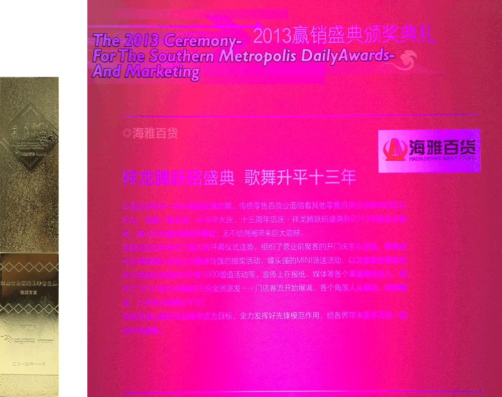 11月22日,由南都全媒体集群·南方都市报、北京大学汇丰商学院主办的“2013中国营销盛典”在华侨城洲际大酒店隆重举行,海雅百货作为深圳资深零售品牌运营商,站在创新营销的视角,被评为零售行业优秀营销案例,并获得2013“年度市民喜爱的零售品牌”。