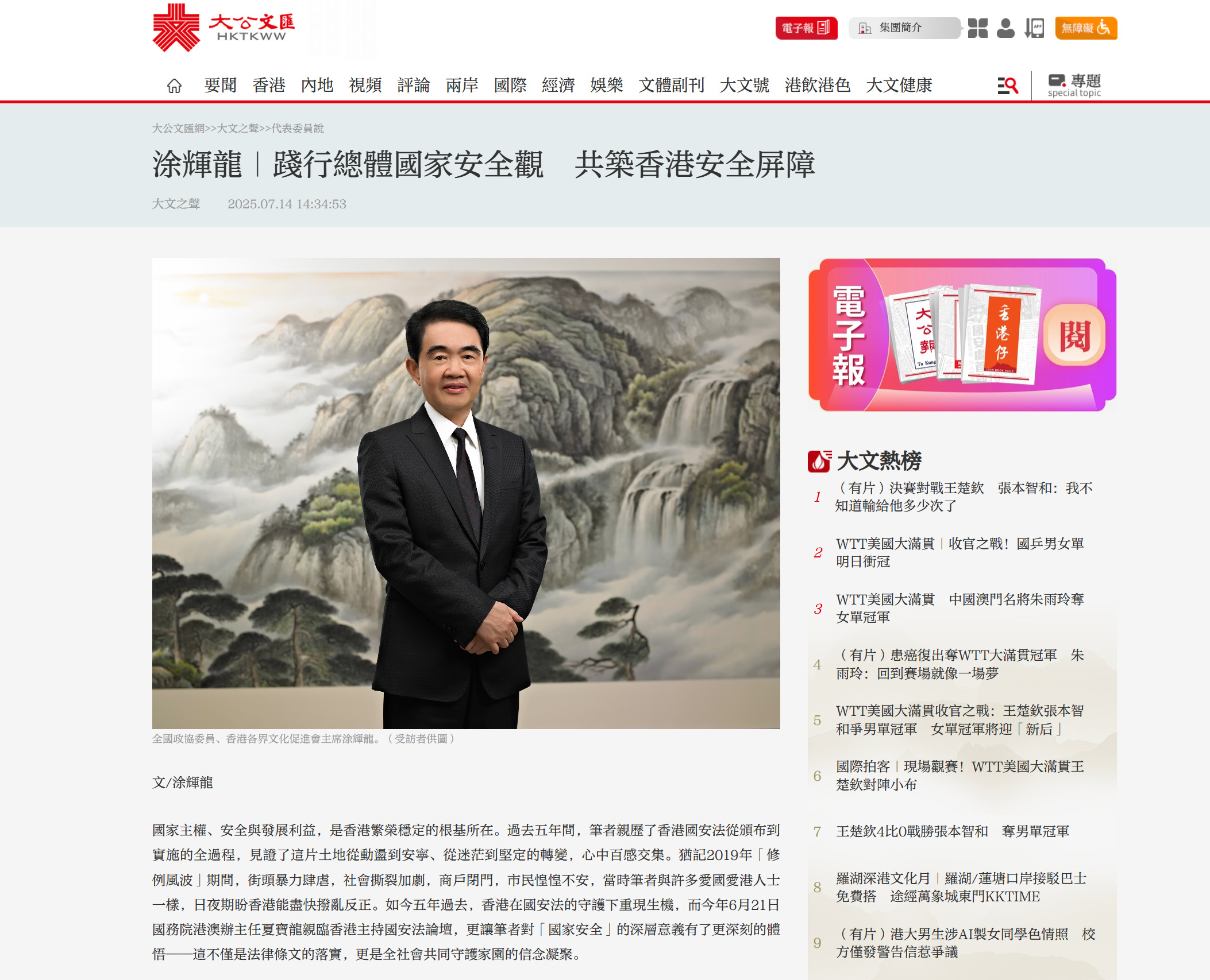 大公文汇网报道|全国政协委员涂辉龙:践行总体国家安全观 共筑香港安全屏障