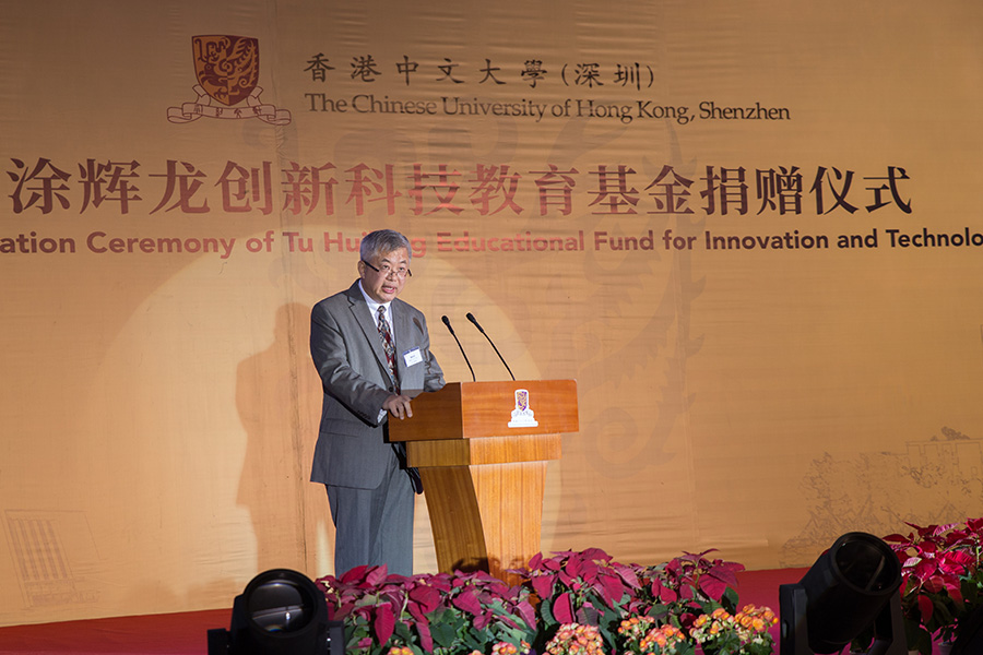 在观赏过由港中大(深圳)学生和海雅艺术团联袂呈现的精彩节目后,香港中文大学(深圳)校长徐扬生教授对参加仪式的嘉宾致欢迎辞。徐校长表示,涂先生提出设立“涂辉龙创新科技奖”用于鼓励和培养科技创新型科研人才的想法与港中大(深圳)要培养“有强烈好奇心、掌握探索新鲜事物的方法、且拥有创造能力的开拓者”的教育理念十分契合。新设立的“涂辉龙讲座教授”席将会进一步助力港中大(深圳)招揽国际尖端科研人才,“将使得我们港中大(深圳)人一代一代把科研成果、探究精神和科研方法传承下去,为开拓一个新世界、为全社会的长远发展做出贡献。”徐校长强调“教育是全社会的事,社会办学自古就是我们中华民族的风尚,我们都应当以涂先生为榜样,尽自己所能,为我们的后辈青年栽下一棵有着阴凉的大树,为他们开辟一条更为宽阔和平坦的接受优质教育的道路,我衷心希望港中大(深圳)的同学们和全体教职员能受到鼓舞、并激励自身,为深圳、为珠三角地区、为祖国和世界的科学发展和创新事业做出更为卓越的贡献!”